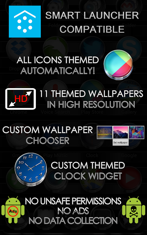Smart Launcher theme. Extremely detailed and high quality elegant and modern Smart Launcher theme with high definition graphics auto-themed icons, 11 custom themed HD wallpapers, and a metal clock widget, to give very detailed and defined graphics even in devices with the highest resolution screens. Everything is themed to the last detail, using metallic textures, lighting effects, reflections and gradients to give a great contrast and quality look.
