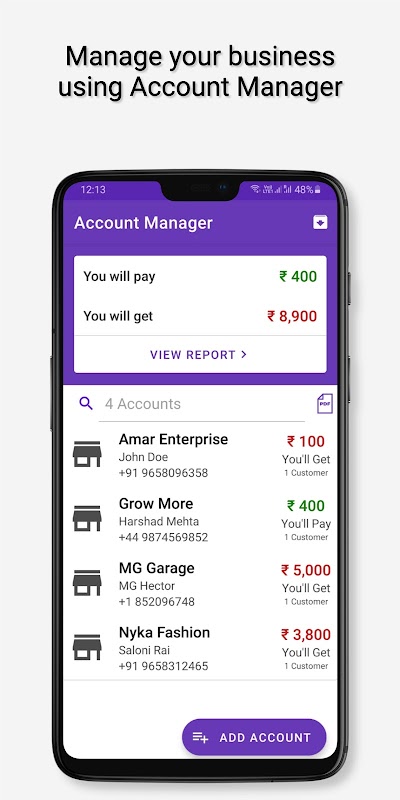 Account Manager also known as Cash Book, Ledger Account Book helps in managing Khata Book for small business and Lenden app. Cash Book and Debit Credit App is used by Okcredit for Udhar Khata and customer account app. Cash Book is also called Lenden or Hisab Kitab Daily. Khata Book is your own Hisab Book and Jama Udhar. Ledger Book helps in entering Credit and Debit records.