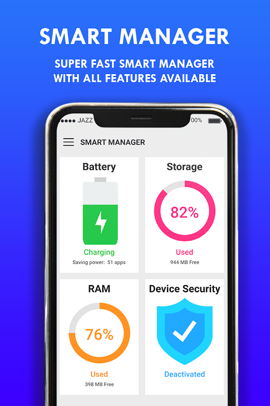 The most trusted and safe Android app is a speed booster, battery saver. Android Smart manager helps accelerate Ram and clean up cache files. The smart manager also provides real-time protection and secures private data with app lock function. Smart Manager is a Battery Managing and fast charging app that allow you to reduce the usage of your phone energy and ensure battery durability.