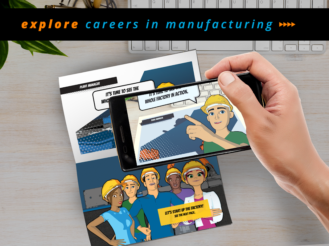 Use the app to scan the target images from the printed pages of the Smart Manufacturing comic book, available through the app and at select MFG Day events, brought together nationally by the National Association of Manufacturers and the Manufacturing Institute. If you don’t already have the comic book you can email it to yourself from within the app for printing in either grayscale or color.