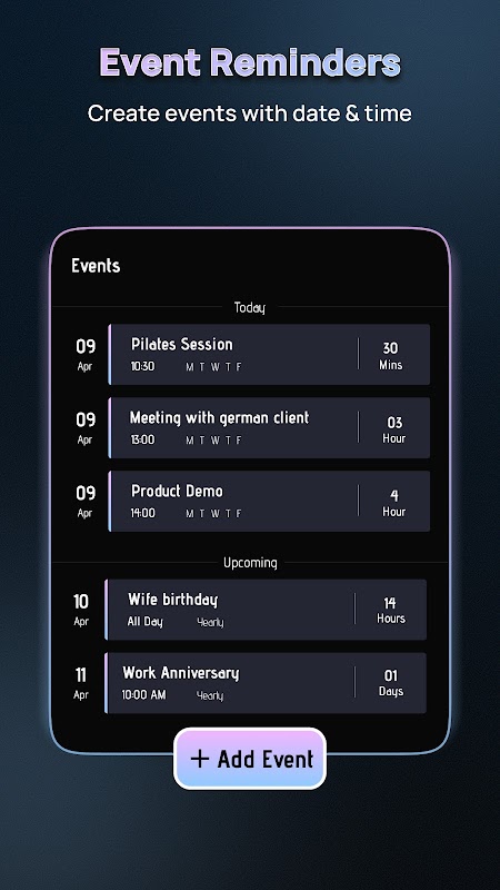 • Event reminders with date, time, and repeat options