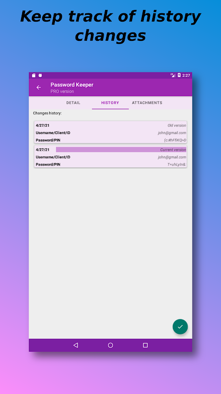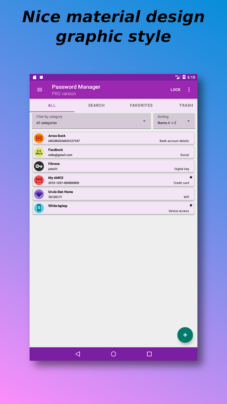 If you are tired of always forgetting the passwords to access your sites or devices then Smart password manager is the right solution. With its local encrypted DataBase it guarantees you đ€maximum securityđ€ and you will only have to remember a unique and familiar key, forgetting all the others.