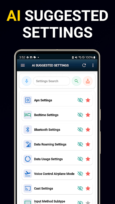 Smart suggestions powered by on-device usage analysis. Learns from frequency, recency, and reliability to show the settings you need most.