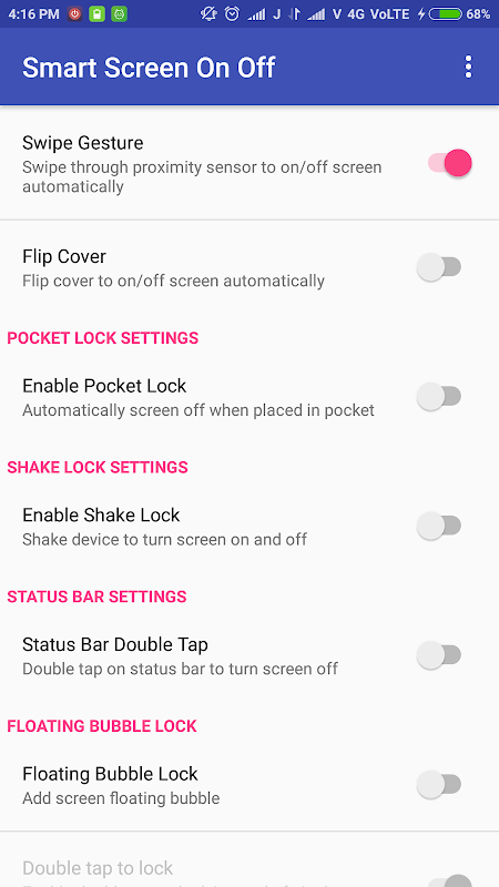 Smart Screen On Off, Double Tap On Off, Status Bar Tap On Off, Proximity On Off.