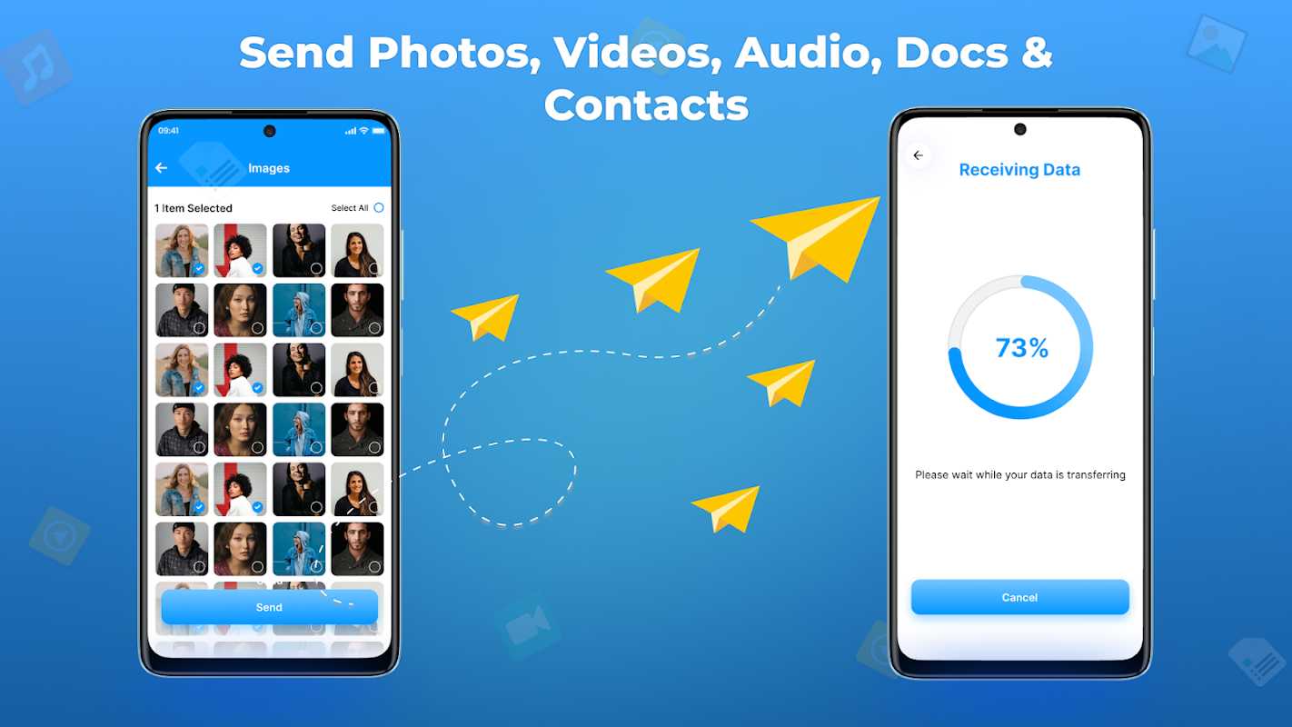 ➡️Data transfer and file sharing app send all type of data like photos, videos, contact ,content and other audio and video files