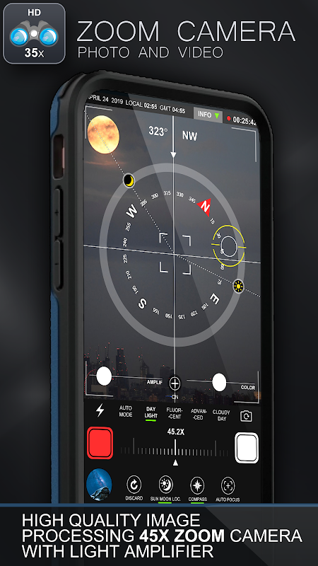 • 45x zoom • Amplifier • Saturation • Light mode • Autofocus • Front, rear camera • Flashlight • Built In library • Sharing • Sun and Moon locator • Sunrise, transit and sunset times for the Sun and Moon • Location permission is needed for sun and moon locator feature, because sun and moon positions related to your location •