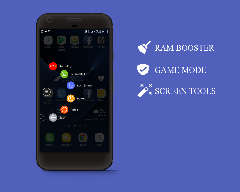 It supports some other useful features such as: Screen shot (Screen capture), Screen Recording, Ram booster (Ram Cleaner). You can also quickly access to all your favorite shortcuts, favorite applications, games, settings and quick toggle too.