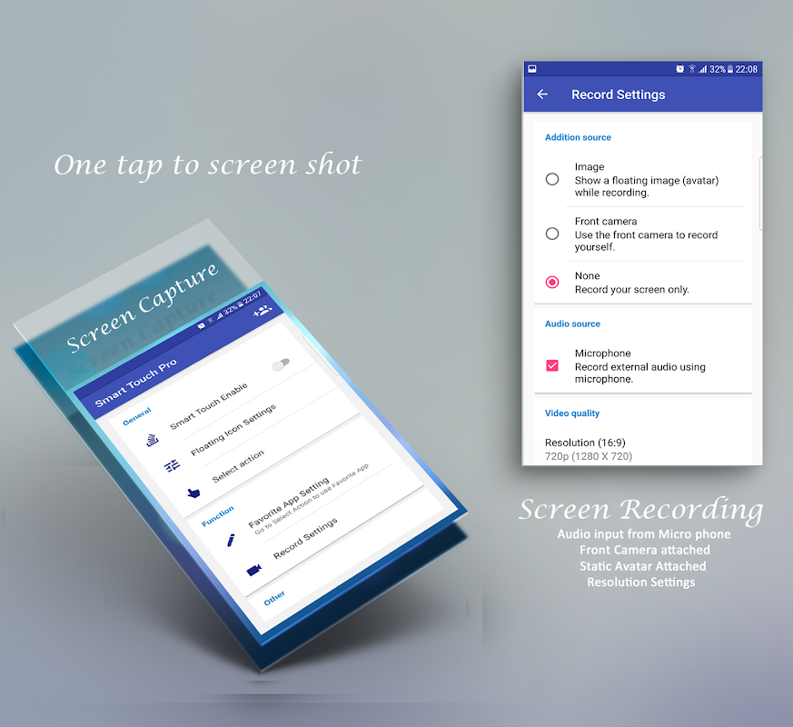 - Easy touch to screen recording, supporting attached image or fron camera (included audio form mic, media system) (Require Android 5.0 and above)