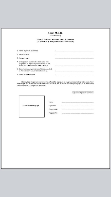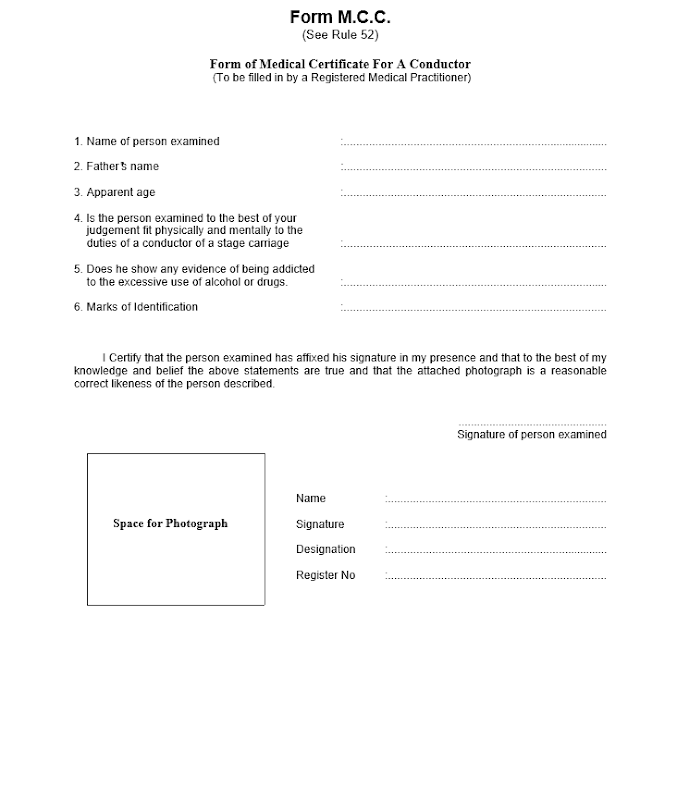 Smart Trichy Tamil Nadu Transport Department Form M.C.C. (See Rule 52) Form of Medical Certificate For A Conductor