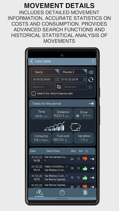 Track every journey with detailed cost analysis. Calculate fuel expenses, see route history with Street View, filter trips by date or type, and export everything to CSV for your records.