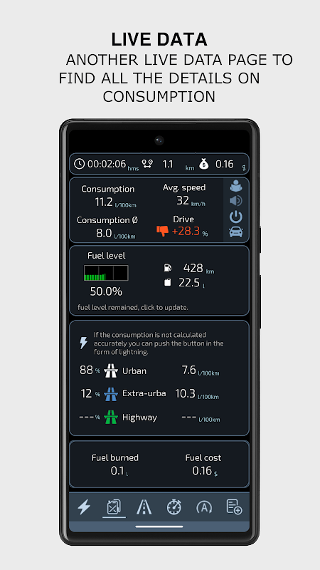 Monitor real-time engine parameters: RPM, temperatures, instant consumption, battery voltage, and more. Fully customizable gauges to display exactly what matters to you.