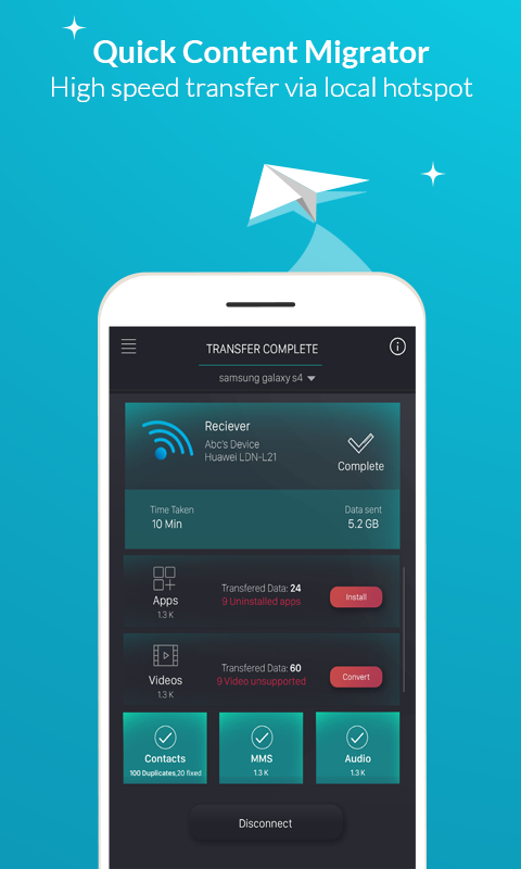 Intuitively share all your personal data to the new phone with this send big files mobile transfer app having exceptional support for android transfer & ios transfer. It quickly copies all the data & serves as best file transfer app, contact transfer app, photo sharing app, messenger migrator and video sharing app. It is efficient data management tool allowing to send large files & transfer contacts from android to iphone and all your old mobile data to new mobile without the privacy loss.