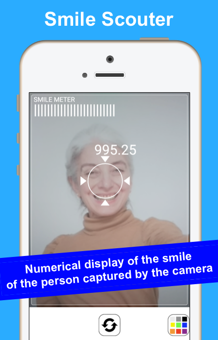 The face recognition technology reads the facial expression captured by the camera, quantifies the smile, and displays the numerical value.