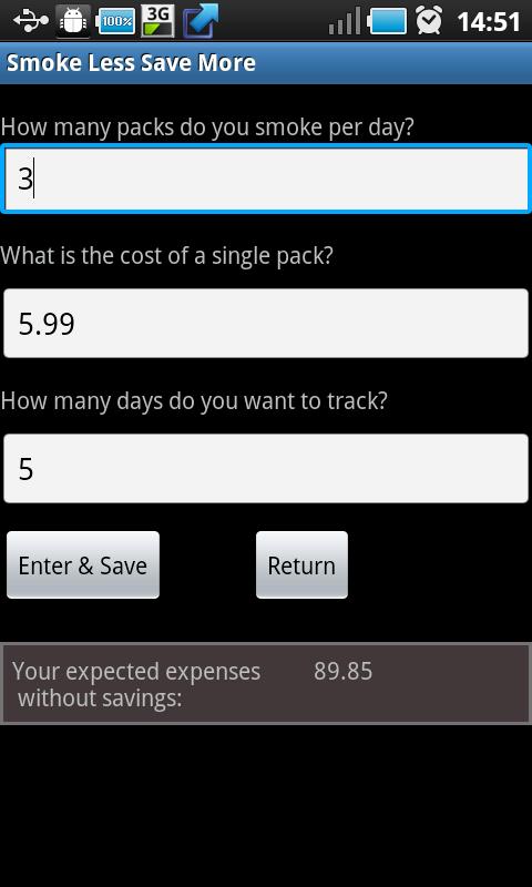 enter the number of packs bought, whenever you buy new packs. Smoke Less Save More will then tell you how much money you would save if you were to stop buying cigarettes right then. At the end of the time period set by you during setup, you will see if you managed to spend less.