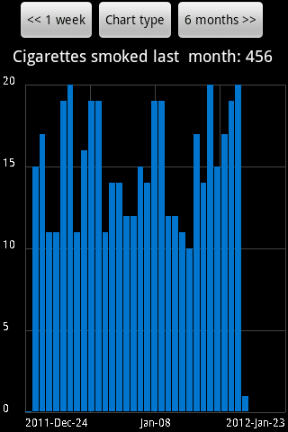 * Shows through graphs the number of cigarettes smoked and money spent in the last 24 hours, 1 week, 1 month, 6 months and 1 year.