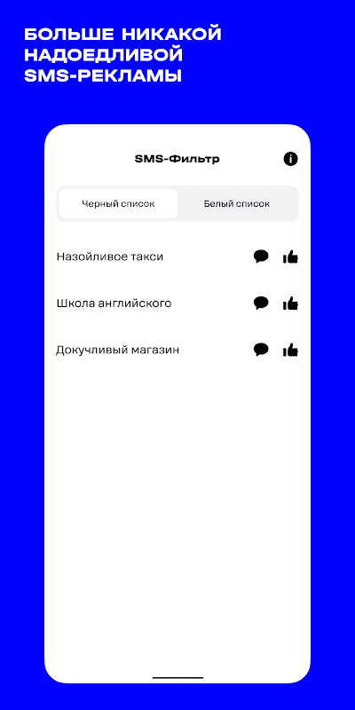 A feature of the service is an intelligent algorithm that blocks the annoying traffic itself, without the need to manually fill in the list of blocked numbers. The functions of the application include viewing the list of senders from whom spam came, with the ability to move them between the white and black lists to block or allow receiving SMS from the selected sender. At the same time, it is possible to view the list of blocked SMS in order not to miss valuable information.