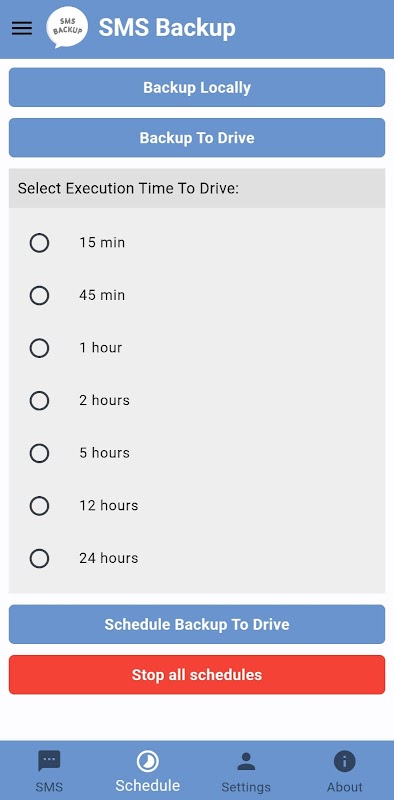 Tired of losing your SMS data?This app helps you doing the backup locally on drive, to Avoid any losses and wasting time you can just setup a schedule with a time and then the app will do the backup automatically!