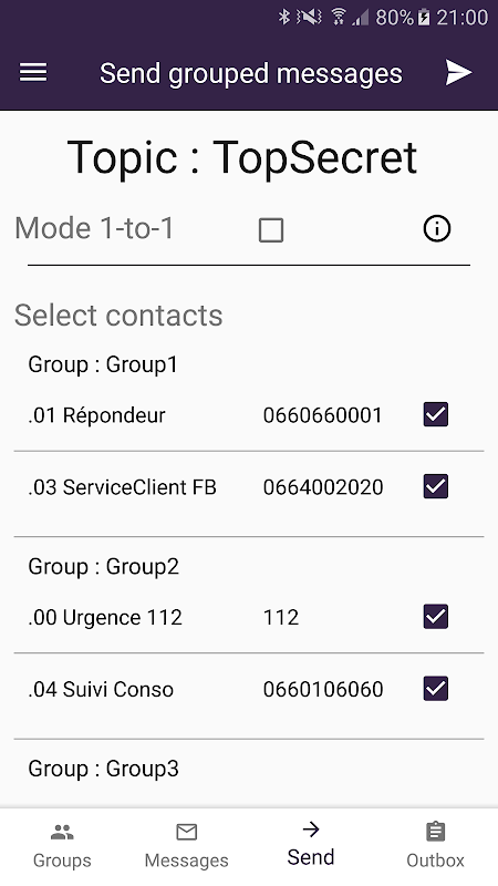 Send customized SMS to multiple group of contacts based on message topic