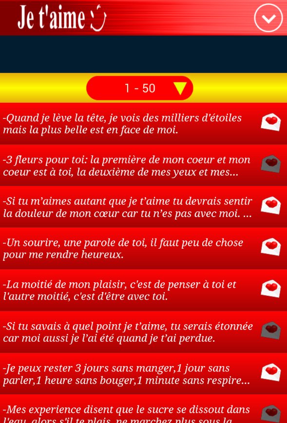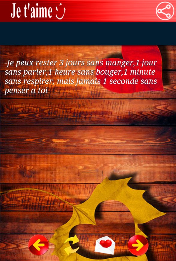Exprimer vos sentiments et envoyer un petit message d'amour en français à votre femme votre fiancée est devenu très facile avec cette application, vous n'avez plus à écrire des SMS, il vous suffit d'ouvrir l'application, de choisir le message que vous voulez envoyer et hop C'est fait!