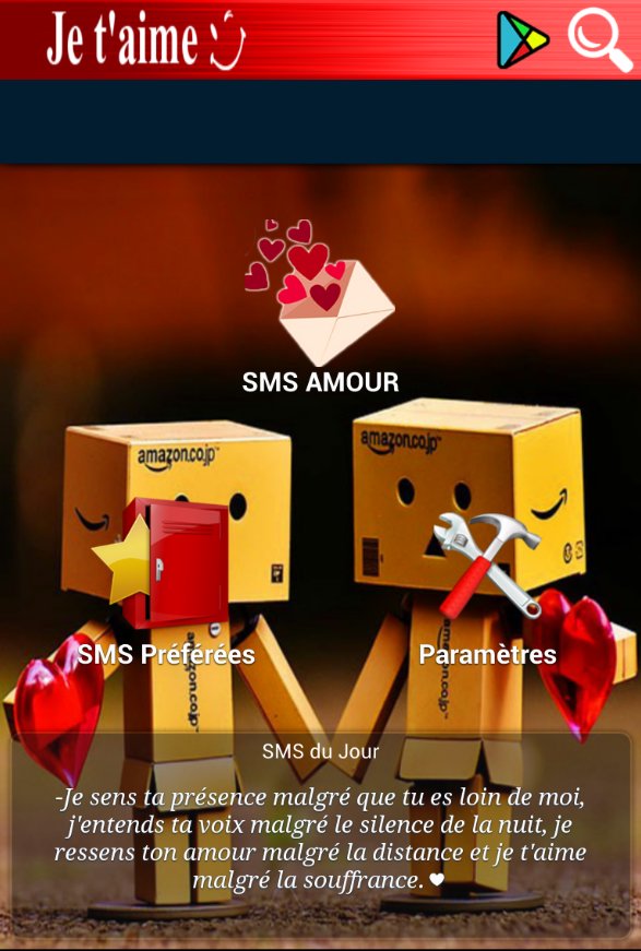 "SMS que j'aime" est une application gratuite, qui vous permet d'envoyer des messages d'amour très doux, et d'exprimer, avec un message d'amour, votre flamme et les sentiments que vous avez envers lui.