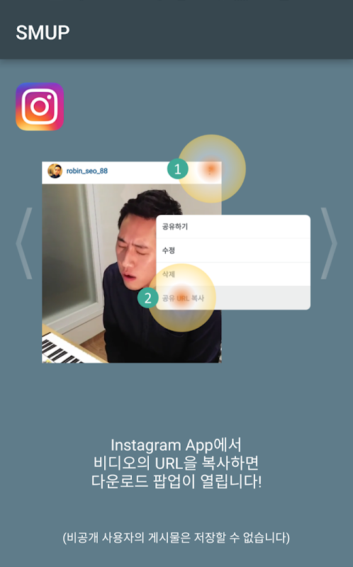 Instagram(인스타그램)이나 Tumblr(텀블러) 등의 SNS를 즐기시다가, 마음에 드는 동영상이 나타나면 "URL 복사" 버튼을 눌러주기만 하면 됩니다. 다운로드가 가능한 동영상이라면 SMUP가 다운로드를 받을지 사용자에게 물어볼꺼예요!