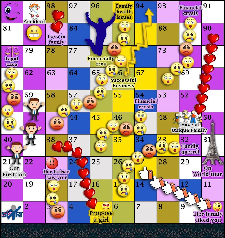 snake and ladder game design (snake and ladder rules with life love story), we include a whole store here including financial and love affair , family, parents, all we included to take a glance of your love life.