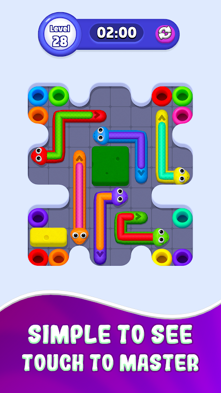 Guide colorful snakes into their matching holes before the timer hits zero! Plan your moves, avoid collisions, and race against time in this exciting puzzle challenge.