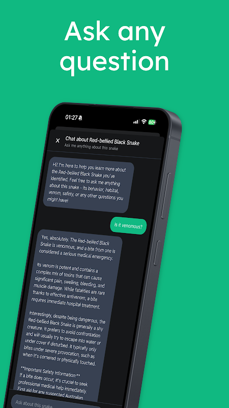 Identify snakes and reptiles instantly with the power of AI. Simply point your camera at any snake or reptile and get detailed information about the species, including crucial safety data and first aid guidance.