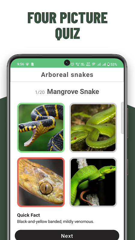 Snake Quiz is a fun, educational trivia game designed for everyone who wants to learn about the world’s most fascinating snakes. Discover hundreds of real snake images, guess the correct species, and challenge yourself with exciting quiz modes. Each question is accompanied by stunning photos and quick facts, making learning both visual and interactive.