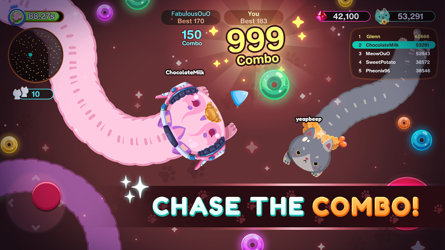 Guide your cat to EAT colorful candy donuts and GROW your cat LONG like a snake! Slither and ZOOM, feasting on donuts and BUSTING other opponents in the arena!