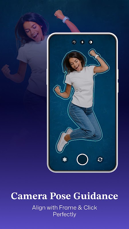 Choose a pose from Live Pose Guidance feature, turn on pose overlay in real-time camera view. Align yourself directly with the pose shown and perfect your posture and angle live. Snap confidently with on-screen pose help. Users can take multiple shots and choose the best one—no hassle.