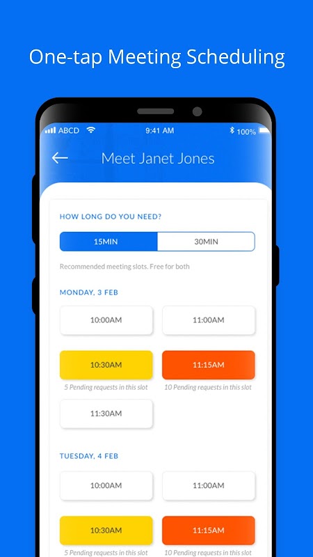 Request a meeting from an attendee’s profile, see when you’re both available, and schedule meetings.