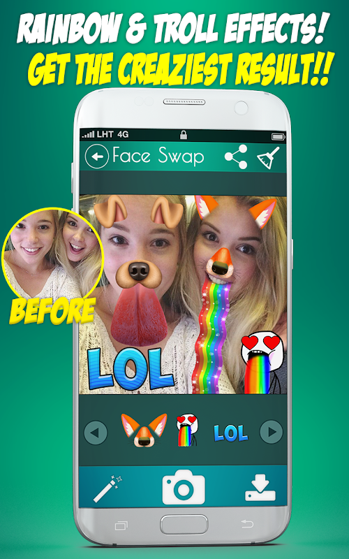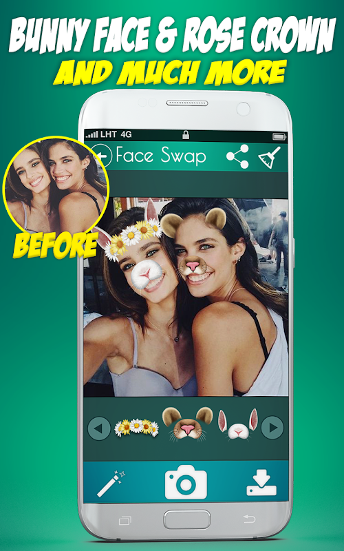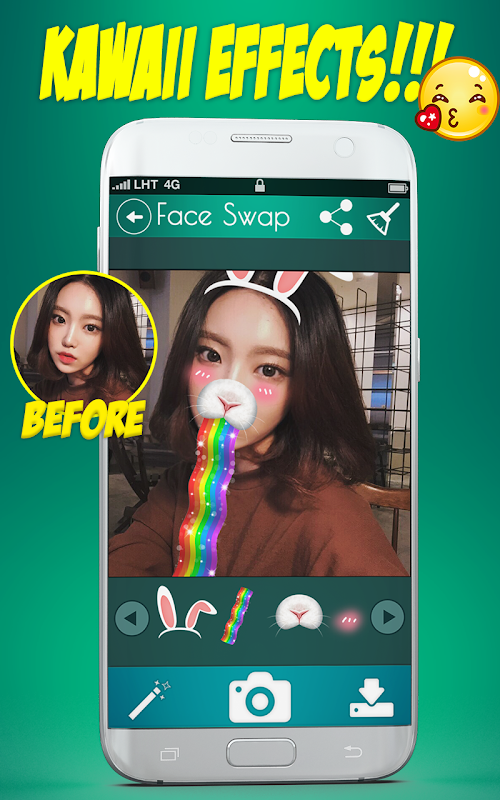 Add funny snappy face effects, puppy doggy face, rainbow effect, cute rabbit, lenses tears, tag text, stickers and emojis, 3D masks, flowers crown and more... to your selfie in just a few seconds!