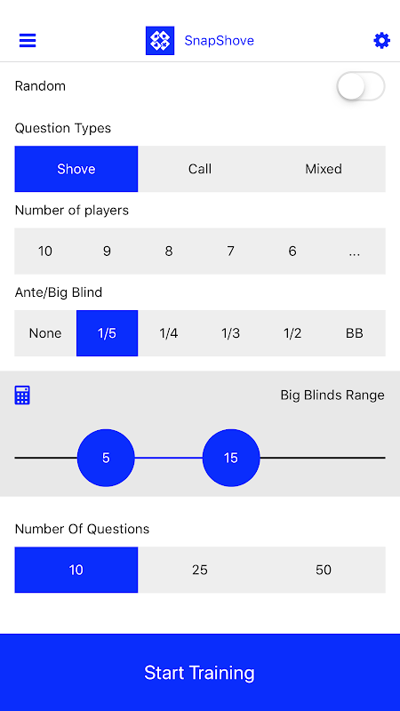 • SnapShove Pro offers even more precise calculations with a wider range of options for player numbers, antes and big blind increments