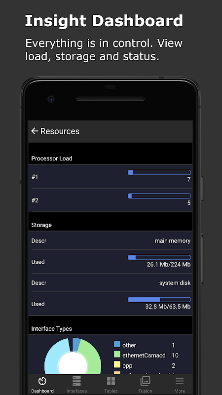 • Insight Dashboard. System information, description, name and uptime. Processor load, storage name, storage used size, storage total size and storage used percentage bar. Fetch interval is 3 seconds.