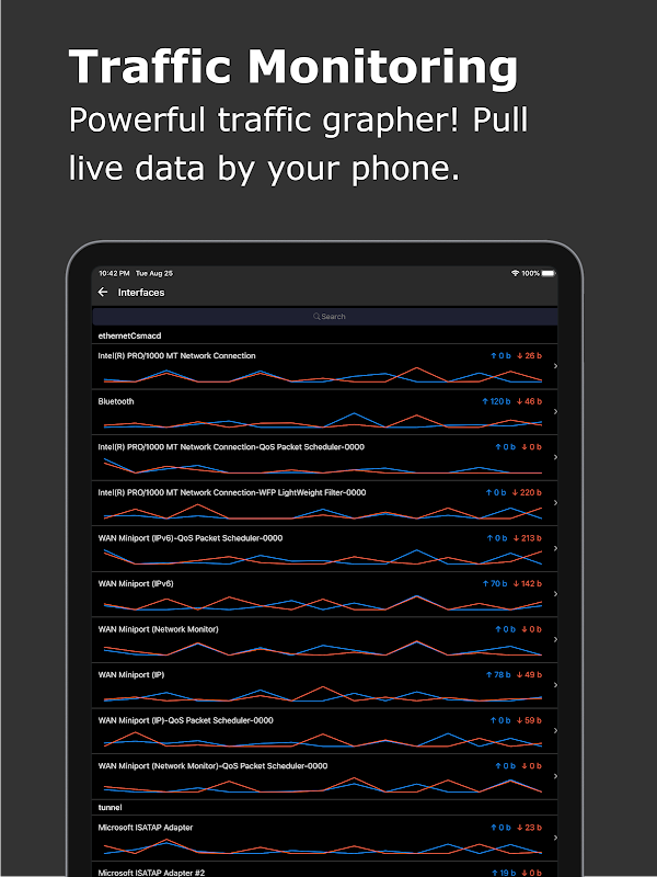 • Traffic Monitoring. Statistics interface types, show grid and pie chart. Live interface rate list, show last tx/rx and mini line chart. fetch interval is 3 seconds. Live interface detail view, show tx/rx last, max and average and large line chart.