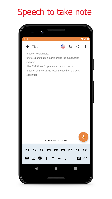 Use the most accurate speech-to-text converter for your notes dictation. This voice recognizer incorporates Google's speech recognition service - the most powerful Artificial Intelligence solution. Our Fast, simple & light app will convert voice to notes so you can save voice memos in the form of notes dictation. Great for regular text notes too, as it's a super simple & reliable speech notepad. Reduces typos & spelling errors and offers more convenient features like Auto capitalization & spacing.