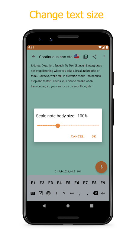 SNotes – Speech to Notes, Speech to Text, Voice Typing does not stop listening when you take a break to breathe or think. Convert voice to notes and Edit text while still in dictation mode - no need to stop and restart. Keeps your phone awake when transcribing so you can focus on your thoughts.