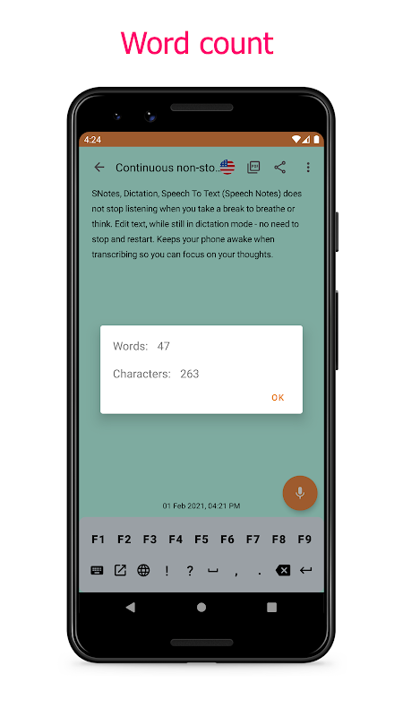 Unlike other voice-typing apps, SNotes – Speech to Text, Voice Typing app does not stop listening when you take a break to breathe or think, and it supports locking your notes by Pin-code or fingerprint. It also supports many fonts for your voice recognition and test conversion. With an intelligent built-in speech notepad keyboard, you can enjoy the ease of notes dictation for words and ease of tapping for punctuation & symbols.