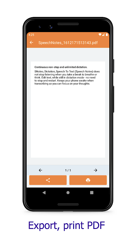 Export, print from note to PDF file format in one tap. Turn your speech into pdf file or printed file never easy like this before.