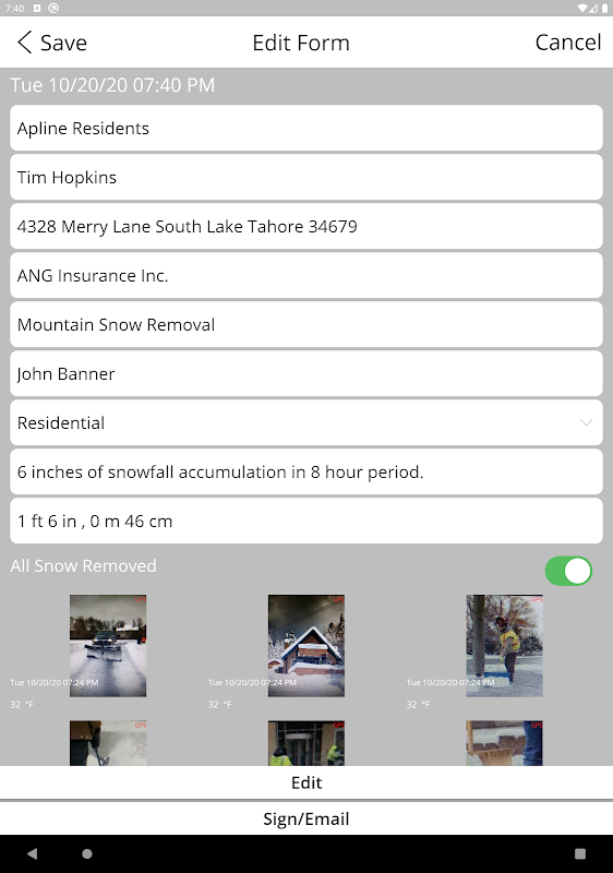 The Snow Removal Application provides a consistent, streamlined documentation and signoff process for field workers to use from beginning of work to signoff. It leverages smartphone technology with our patent-pending, time-locked documentation process that includes embedded photos watermarked with time, date, ambient temperature, and GPS location, in addition to sorting, storing, and emailing documents and enabling signature capture (E-Sign) with Cloud syncing on multiple devices (iOS).