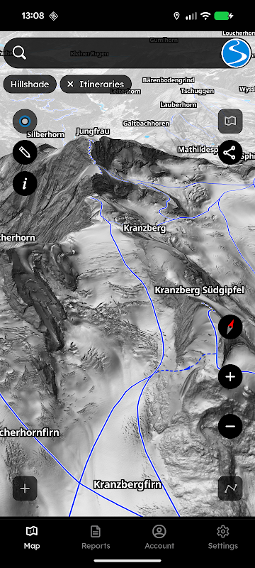 - Points of Interest (recent outings, route guides, mountain huts, webcams, ski resorts)
