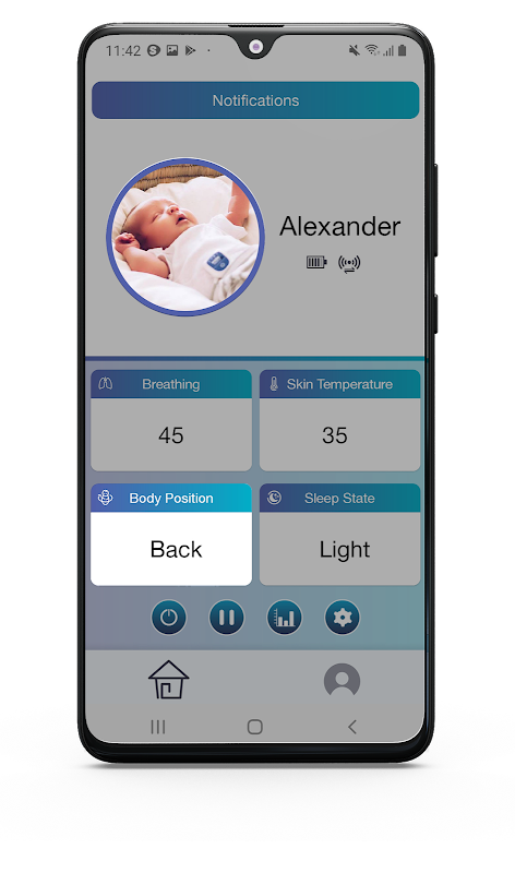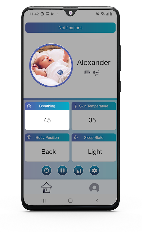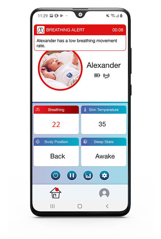 The Snuza Connect application connects to the Snuza Pico device via Bluetooth Low energy and allows for real-time monitoring of abdominal movement rate, skin temperature, body position and even fall detection if your baby takes a tumble! It allows users to set custom alarms and warnings for breathing rate temperature and position.