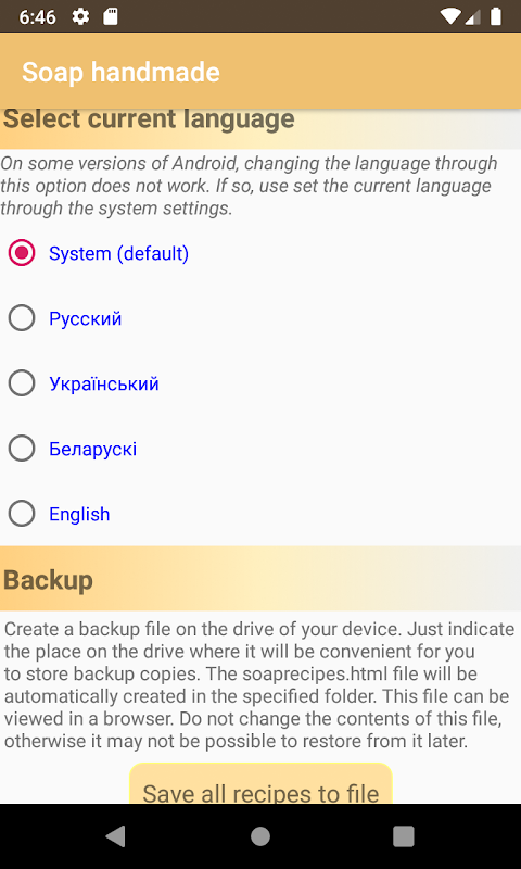 - Ability to create a backup copy of recipes on the drive of your device so that you can later restore them or transfer them to another device.