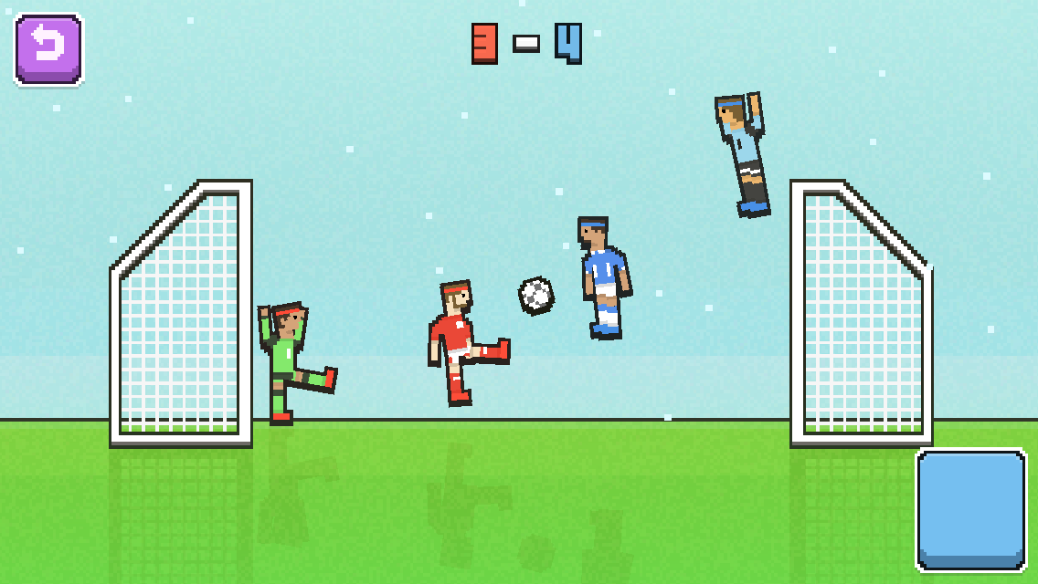 Tap the button to jump and kick. You control both your soccer players with just one button. Kick the ball into your opponent's goal to score.