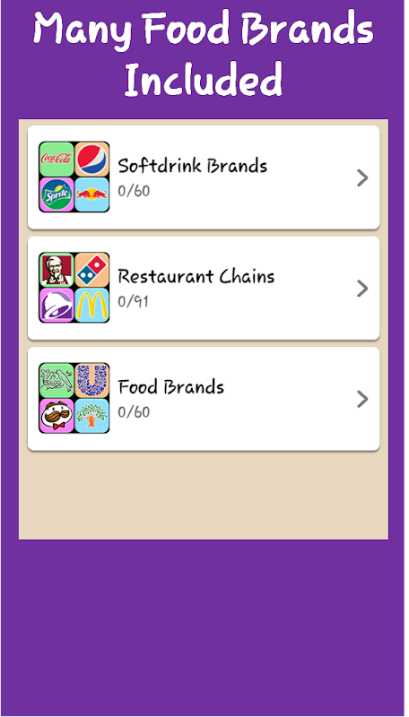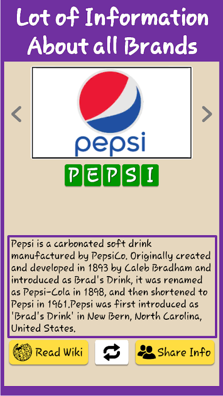 Soft Drinks Quiz - is a brand new food brands logo trivia game with 60 best soft drink brands and 150+ other Food brands from all over the world to guess and lot of information about all brands.