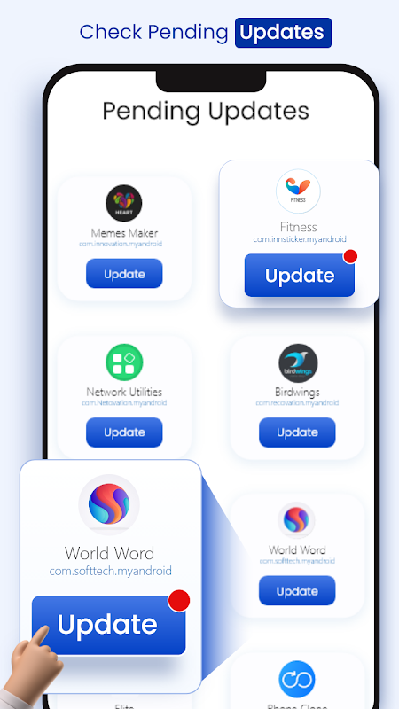 -update Downloaded apps: User apps update checker tool scans for updates of downloaded apps on your mobile and shows the apps in a single tab where you can install updates of all user apps in one place. You can upgrade multiple apps and games to the latest versions quickly.