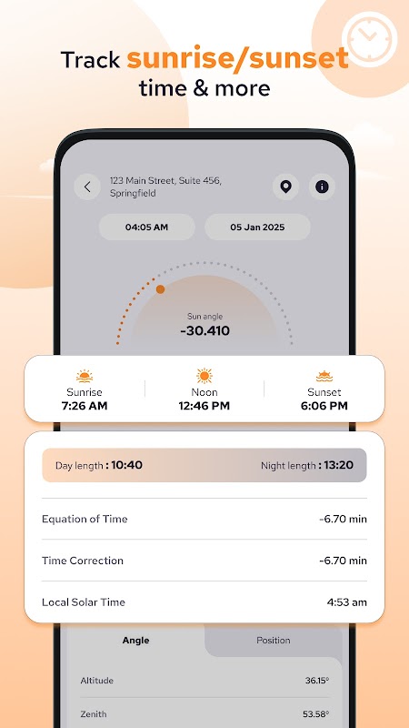 • Helps you Track the sun's position, sunrise, sunset, and day length specific to your location.