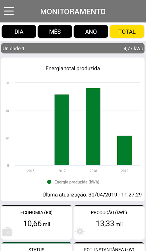É possível visualizar a todo momento a produção solar, consumo de energia e as economias alcançadas.