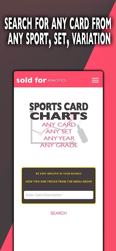 The *NEW* Sold For Application application is specific to charts. The application will let you type in anything you choose, or use the "Slab Reader" to pull up recent sales. As of right now, all recent sales are from eBay listings. Sold For Analytics will allow you to search for any card, any set, any year, and grade. If I can find it, I will display it...period.